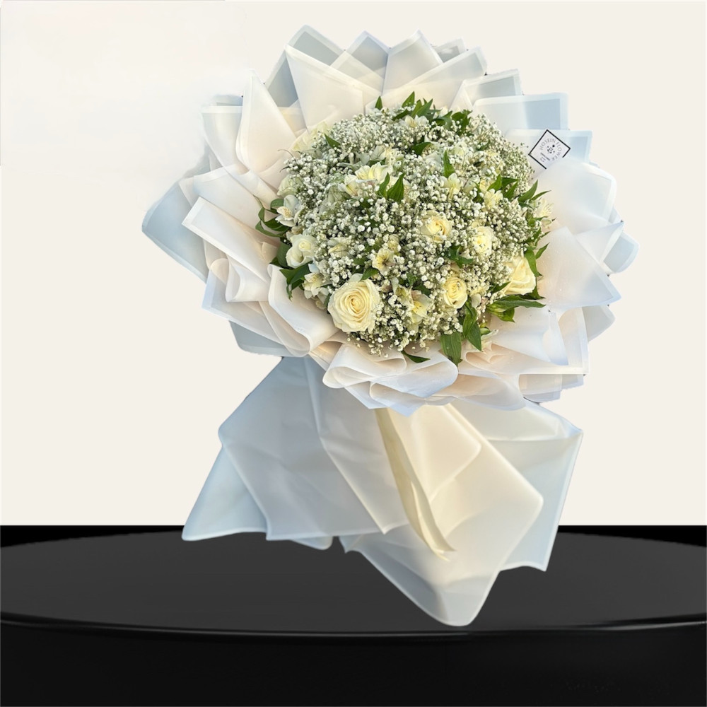 یک دسته گل بزرگ و زیبا با ترکیب خاص از رز، الستر و گل عروس، انتخابی بی‌نظیر برای هر مراسم خاص به‌ویژه مراسم خواستگاری است. این ترکیب ظریف و شگفت‌انگیز از گل‌ها، نمادی از عشق، زیبایی و شروع یک زندگی مشترک است که احساسات شما را به زیباترین شکل ممکن منتقل می‌کند.