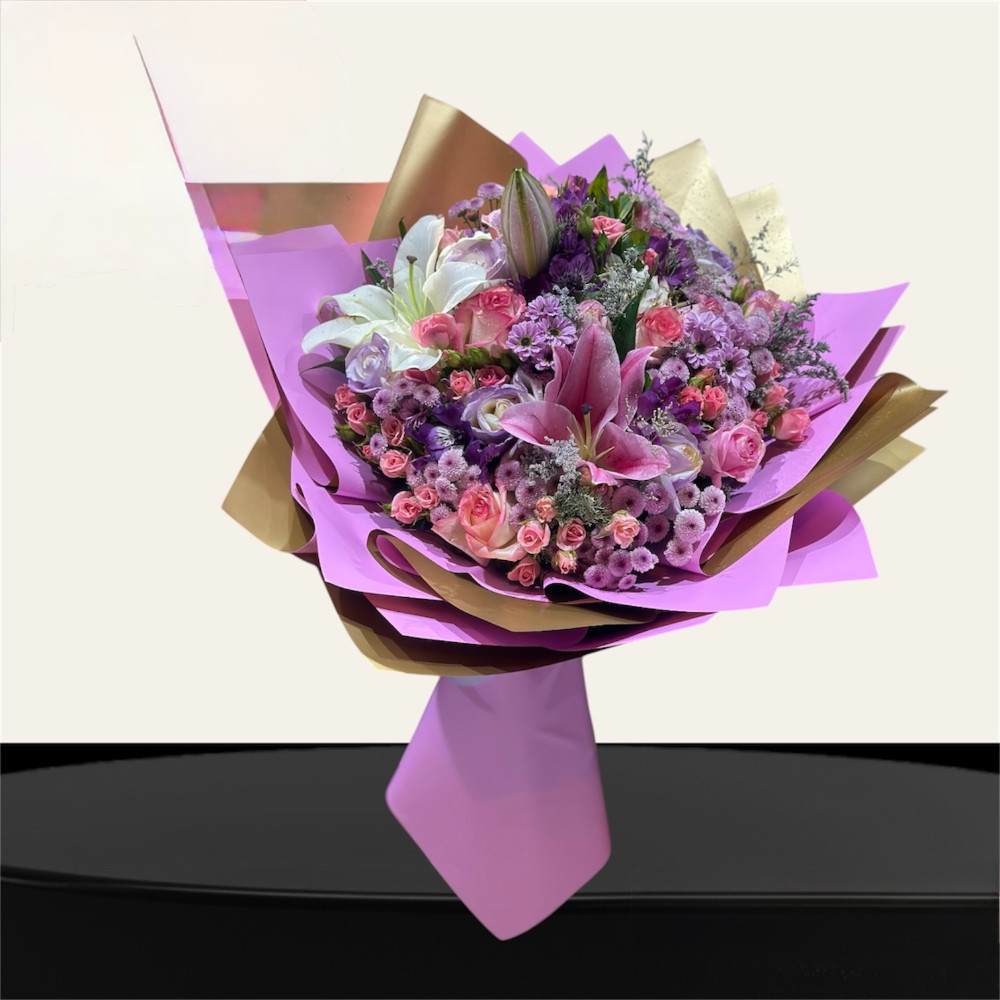 این دسته گل شیک با ترکیب لیلیوم، داوودی، رز و رزمینی، یک انتخاب عالی برای مناسبت‌های ویژه مانند خواستگاری، تولد یا سالگرد است. لیلیوم نماد زیبایی و شکوه، داوودی نماد دوام و پایداری، رز نماد عشق و محبت و رزمینی نماد ظرافت و زیبایی است. این ترکیب گل‌ها با رنگ‌های زیبا و طراحی خاص، احساسات شما را به بهترین شکل منتقل می‌کند.