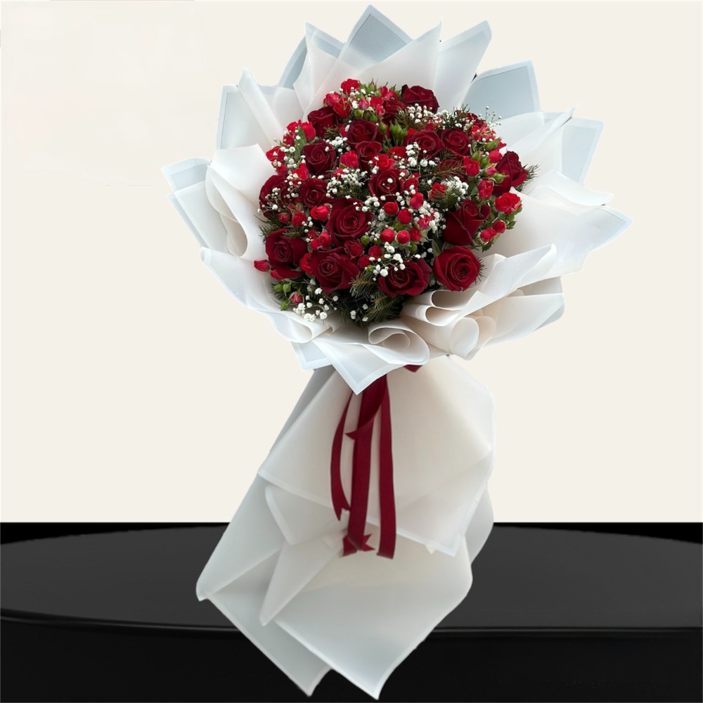 دسته گل رز سرخ، رز مینی و گل عروس | ایده‌آل برای خواستگاری