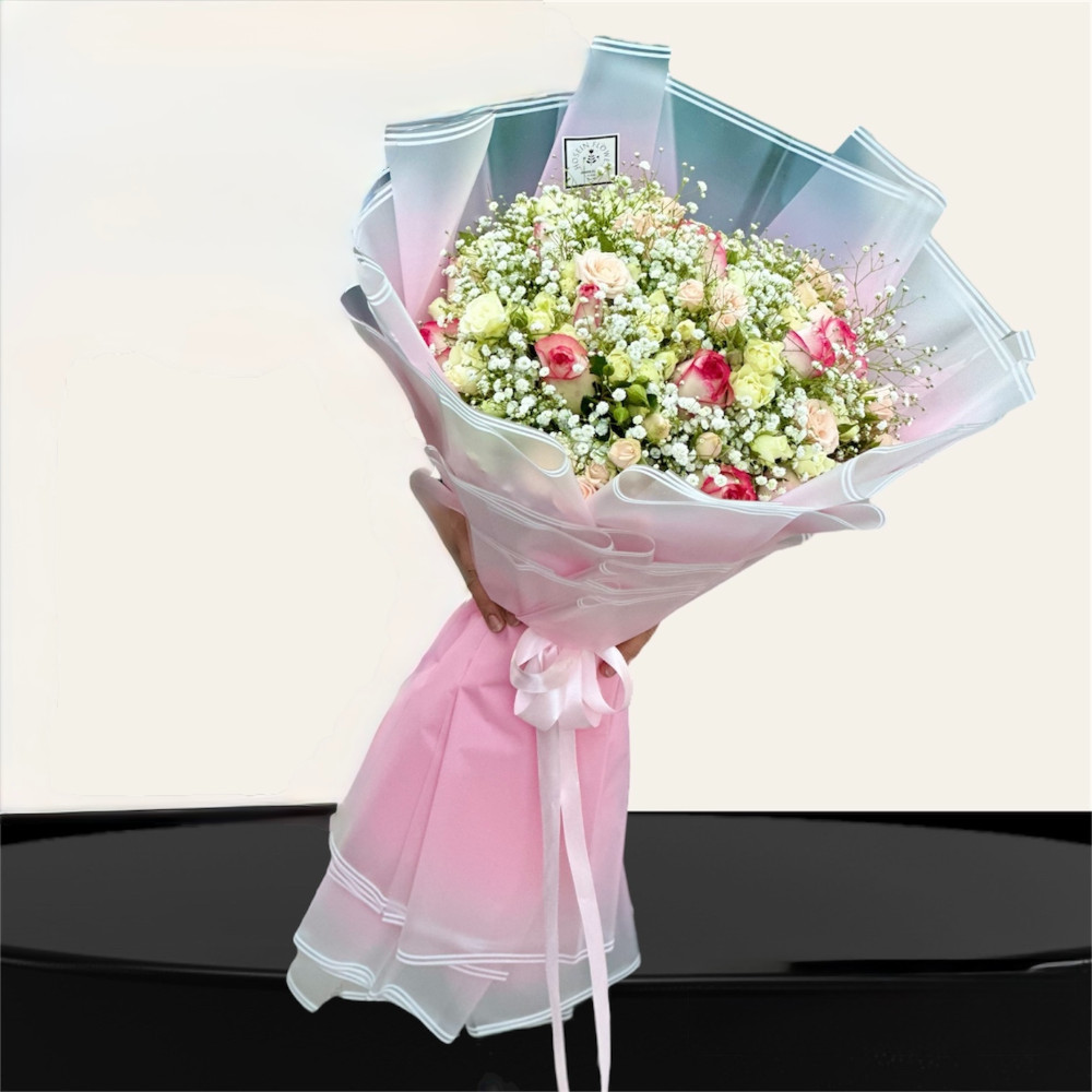 این دسته گل لوکس با ترکیب رزهای بزرگ و رز مینی، گزینه‌ای ایده‌آل برای کسانی است که می‌خواهند احساسات خود را به بهترین شکل بیان کنند. رز نماد عشق و محبت و رز مینی نماد زیبایی و ظرافت است. طراحی این دسته گل با گل‌های تازه و طبیعی، نشان‌دهنده دقت و توجه شما به جزئیات است.