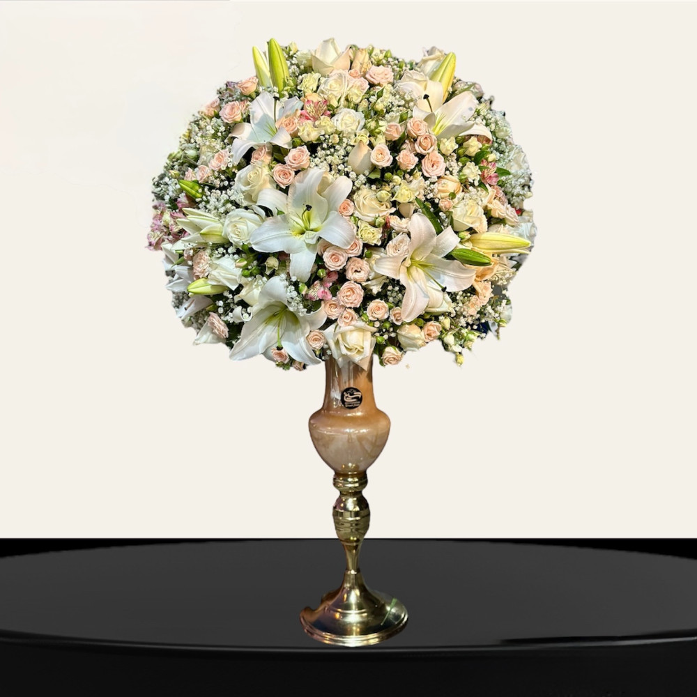 یک جام گل بزرگ و زیبا با ترکیب شگفت‌انگیز از رز مینی، لیلیوم و رز، انتخابی ایده‌آل برای هر مراسم خاص و ویژه است. این ترکیب پرشکوه از گل‌ها، نمادی از عشق، زیبایی و احترام است و فضای هر محیطی را با ظرافت و شکوه خاصی تزئین می‌کند.